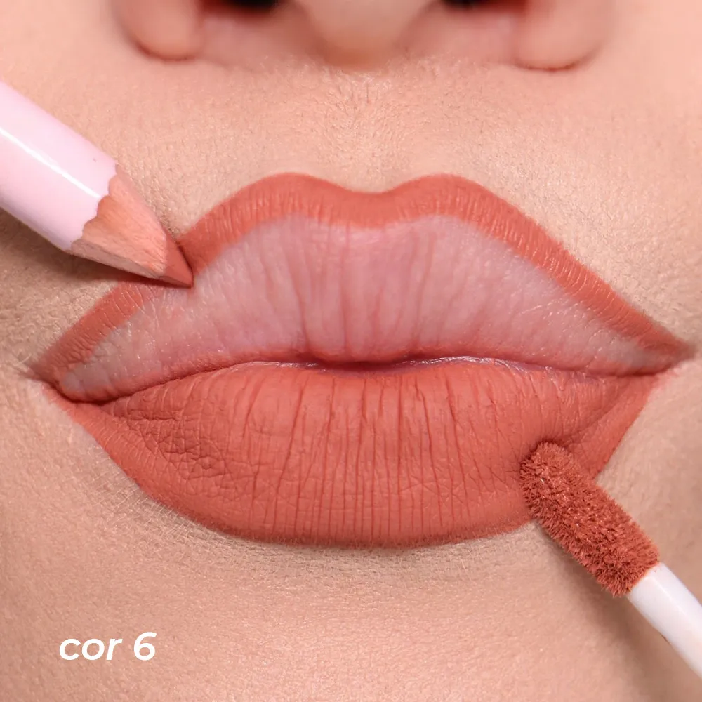 Faça o contorno dos lábios com o lápis seguindo o desenho natural dos seus lábios. Em seguida, preencha com o batom líquido até obter o efeito desejado.